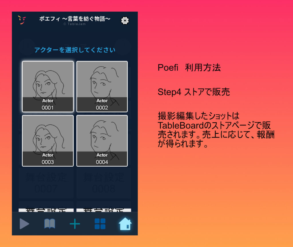 制作物は絵コンテアプリで販売します。売上に応じて、報酬をお支払いします。