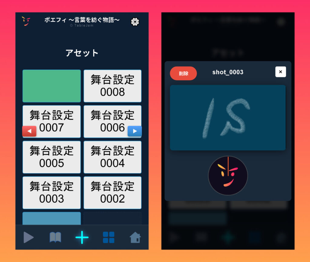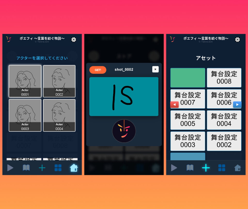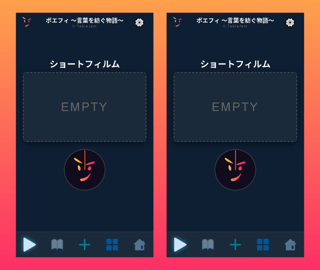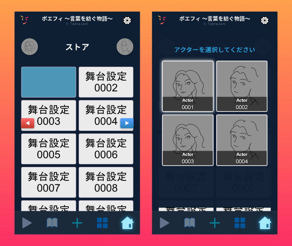 アプリ下部に5つのボタンがあり、左から順に再生、ストーリーボード、アセット、エディット、ストアです。